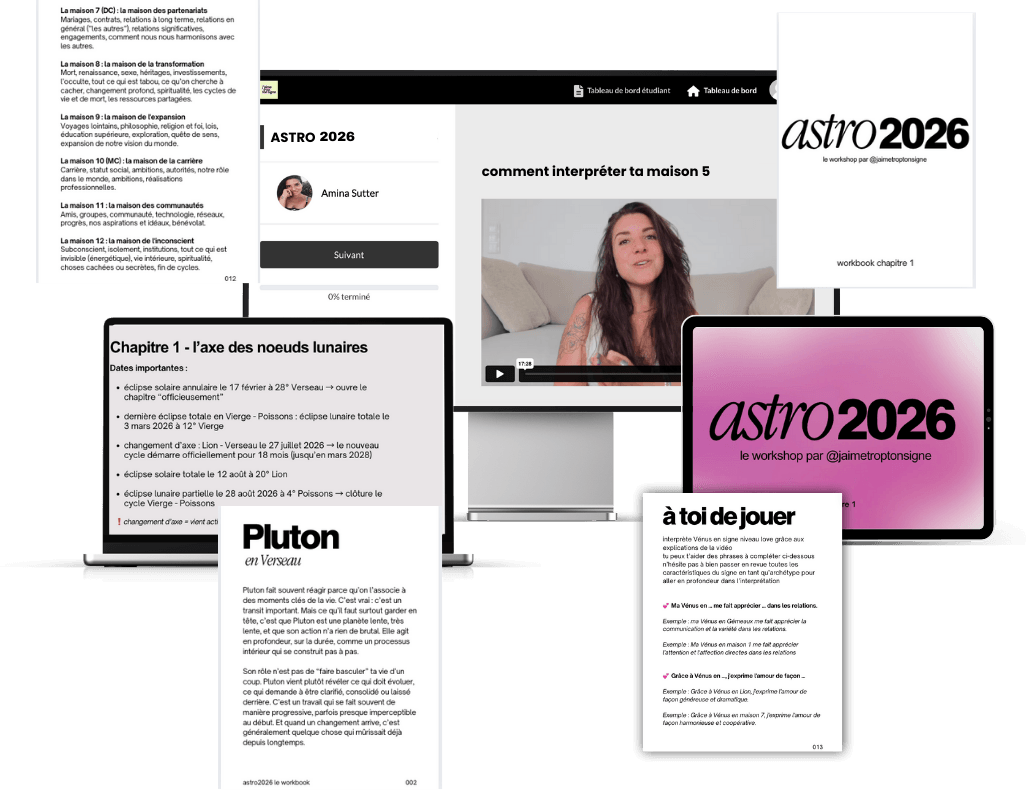 Chaque partie est composée d’une vidéo ultra claire et directe qui t’explique pas à pas comment lire les transits de 2026 appliqués à ton thème astral et repérer tout de suite les infos clés pour comprendre comment tu vas être impactée cette année.